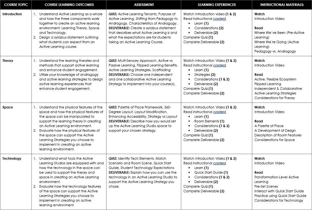 Objective Identification: I delineated the objectives that learners were expected to achieve by the conclusion of the course. These objectives were crafted to ensure alignment with the overarching goals of the instructional program: improve student engagement through increasing utilization of the Active Learning Studios.